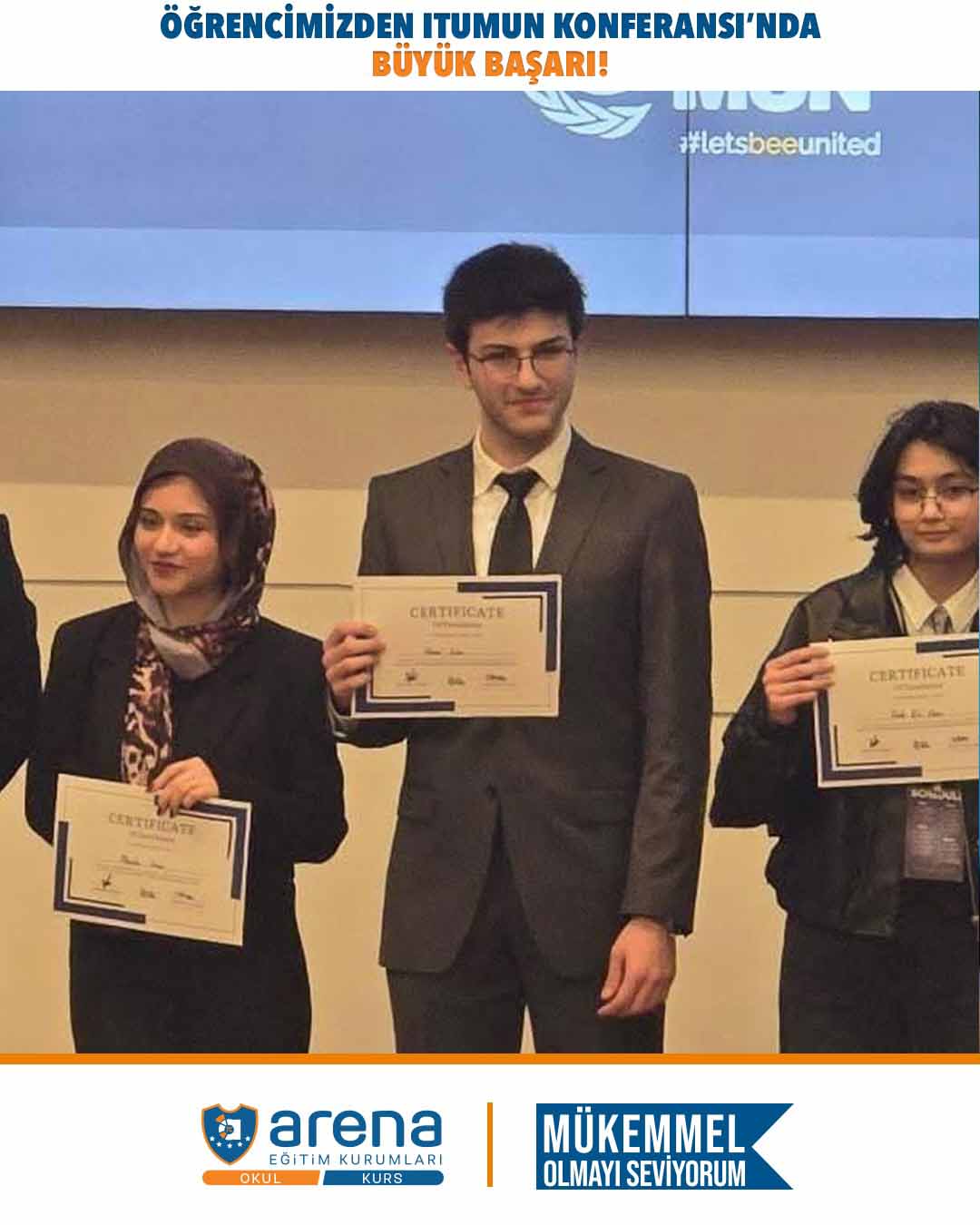| 11. sınıf öğrencimiz Atahan Şahin, İstanbul Teknik Üniversitesi’nin her yıl düzenlediği ITUMUN Konferansı’na bu yıl 26-29 Ocak 2026 tarihleri arasında katıldı. UNHRC komitesinde Japonya’yı başarıyla temsil eden öğrencimiz, gösterdiği üstün performansla Outstanding Delegate (Üstün Performans Gösteren Delege) ödülüne layık görüldü. Öğrencimizi bu önemli başarısından dolayı tebrik ediyor, MUN yolculuğunda nice başarılar diliyoruz! |