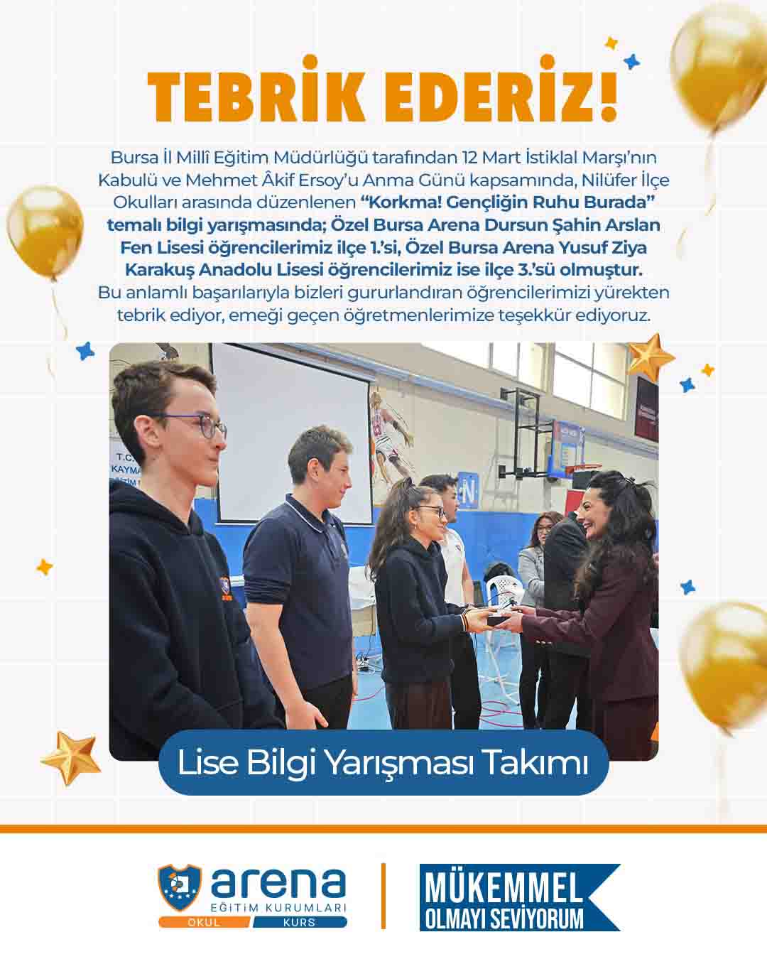 Bursa İl Millî Eğitim Müdürlüğü tarafından 12 Mart İstiklal Marşı’nın Kabulü ve Mehmet Âkif Ersoy’u Anma Günü kapsamında,Özel Bursa Arena Dursun Şahin Arslan Fen Lisesi öğrencilerimiz ilçe 1.’si, Özel Bursa Arena Yusuf Ziya Karakuş Anadolu Lisesi öğrencilerimiz ise ilçe 3.’sü olmuştur.