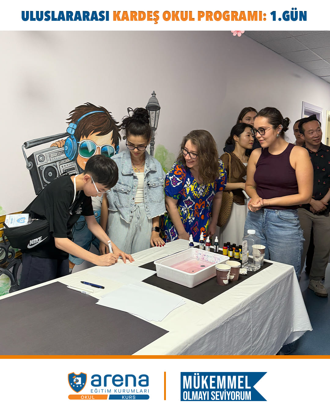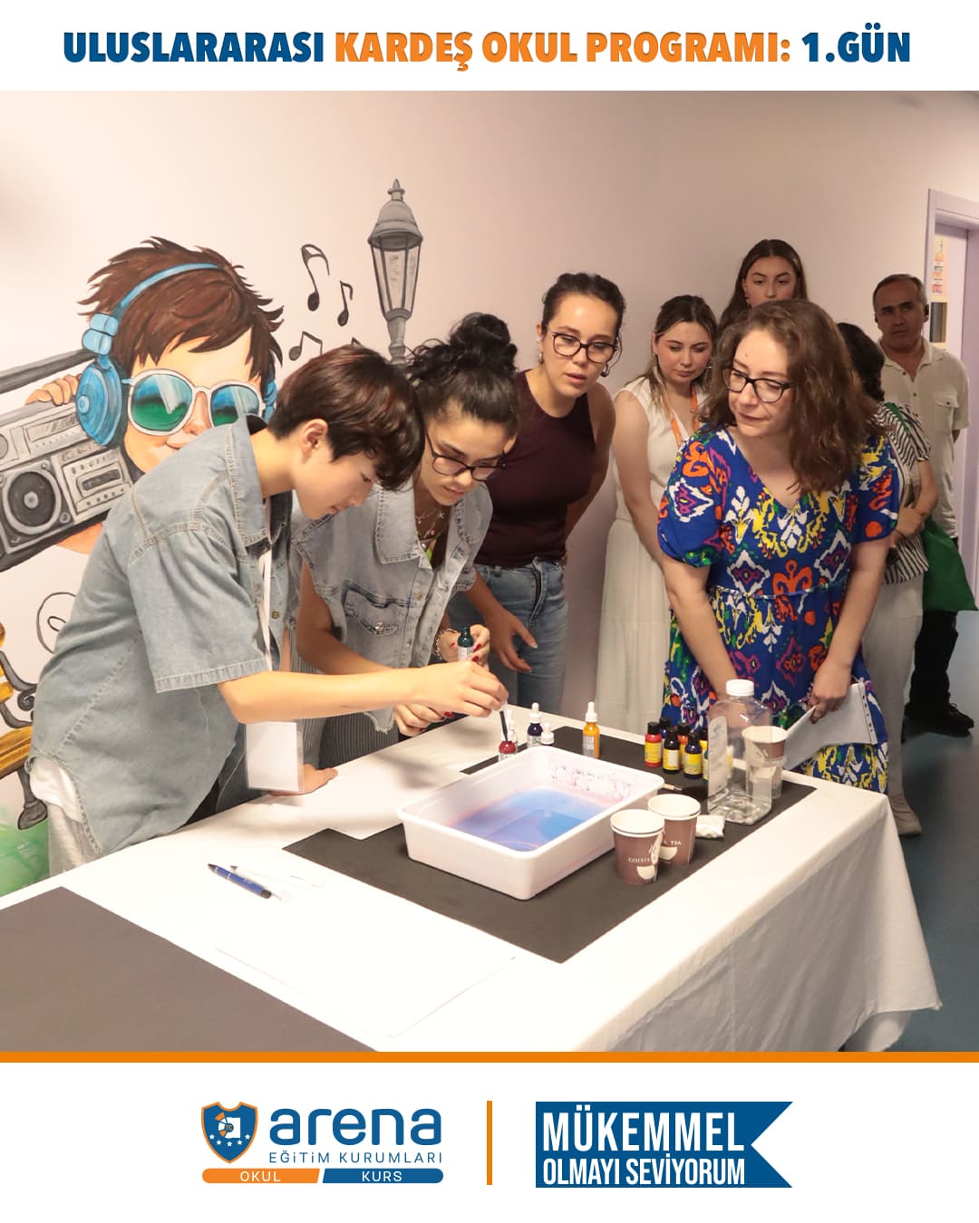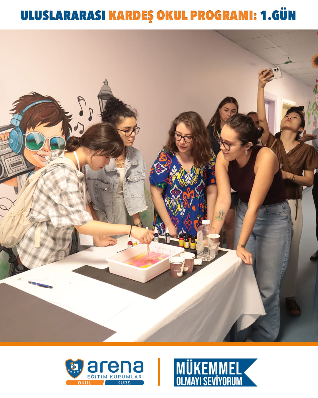 Ardından ebru sanatı etkinliğimiz ile geleneksel sanatımızı birlikte deneyimleme fırsatı bulduk. Misafir öğrencilerimize yöresel kıyafetlerimizi giydirerek kültürel bağlarımızı pekiştiren keyifli bir fotoğraf çekimi gerçekleştirdik.