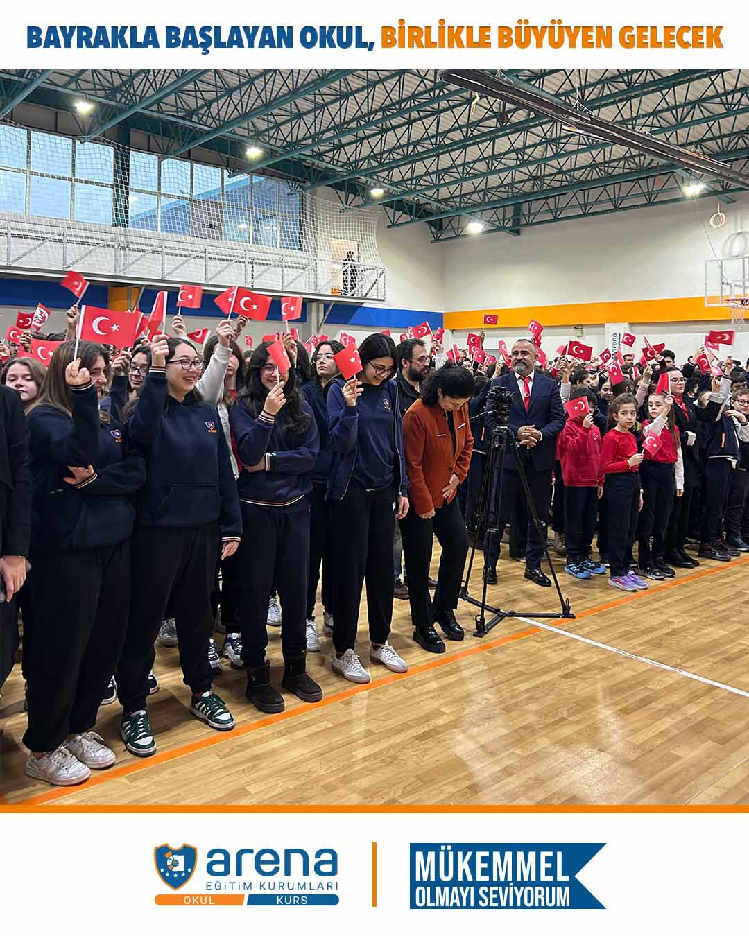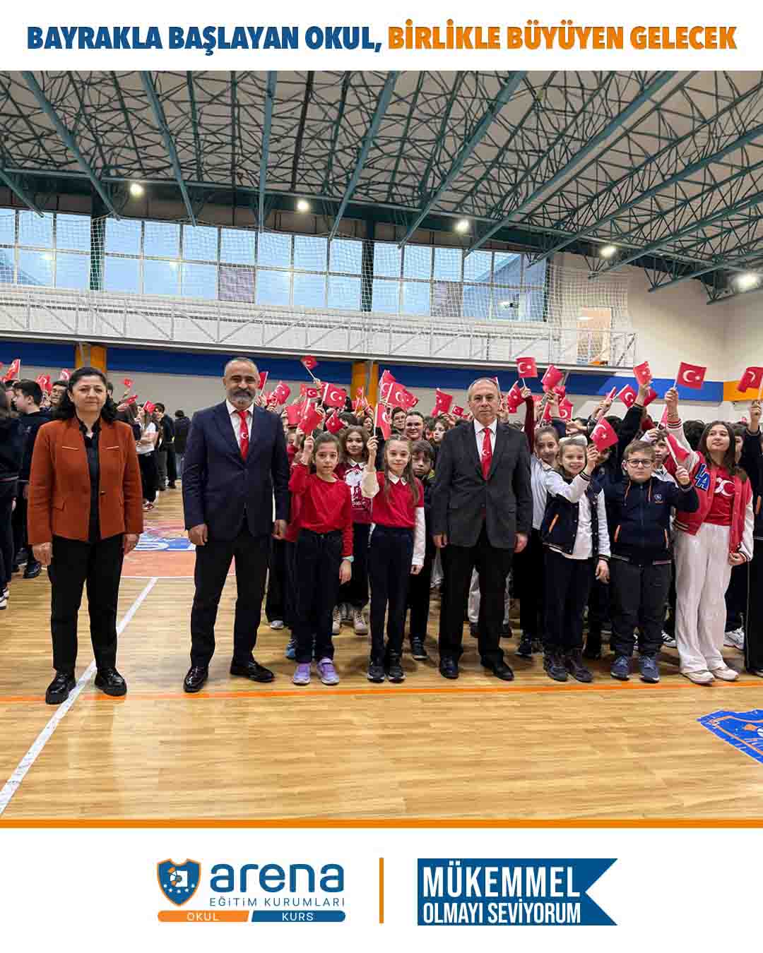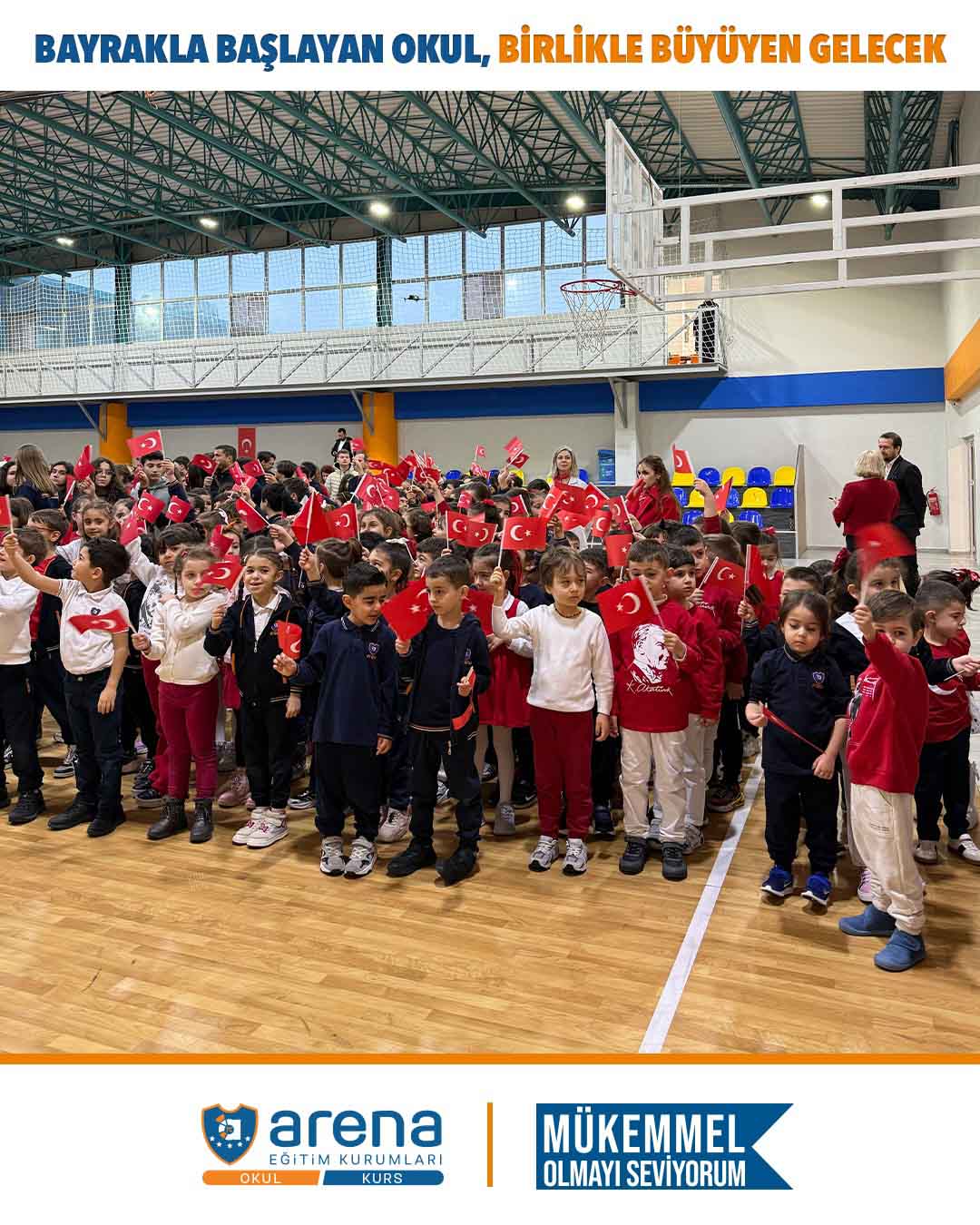 | Bugün sabah spor salonumuzda, bayrak sevgisi temasıyla İstiklal Marşı törenimizi gerçekleştirdik. İl Millî Eğitim Müdür Yardımcımız Mustafa Kahya’nın ve Arena Eğitim Kurumları Yönetim Kurulu Başkanı Celal Arslan’ın katılımıyla; bayrağımıza duyduğumuz sevgiyle İstiklal Marşımızı bir bütün olarak yaşadık. |