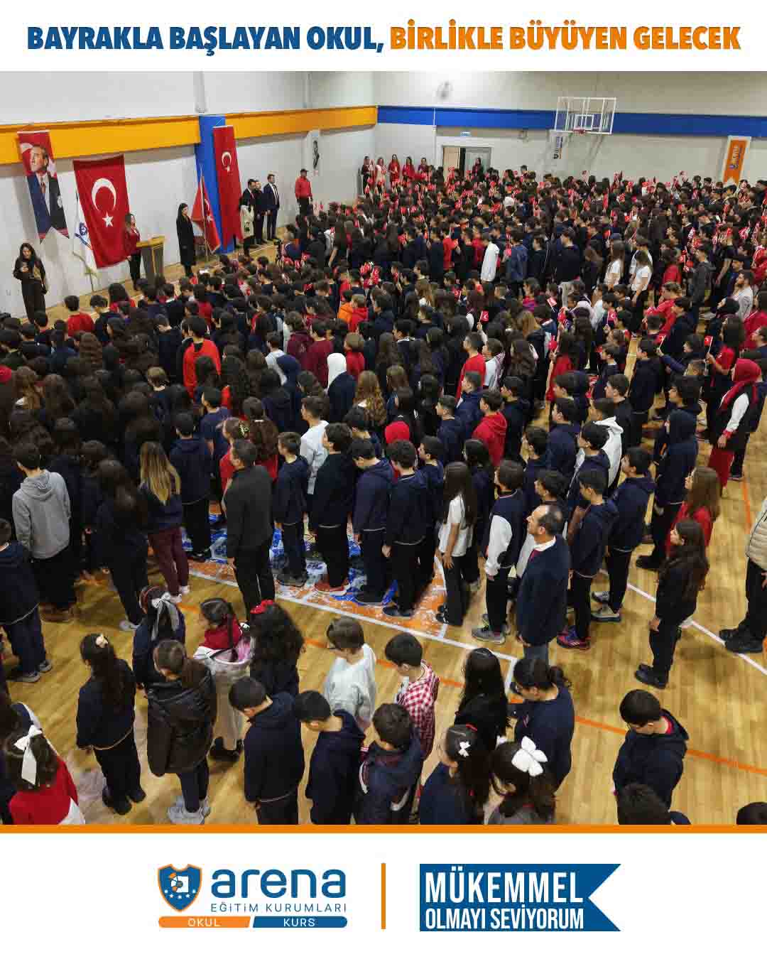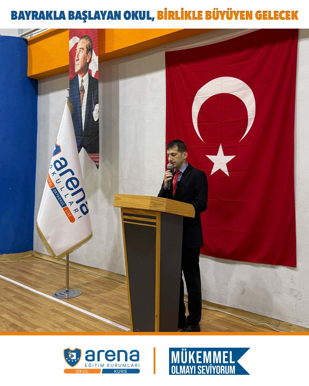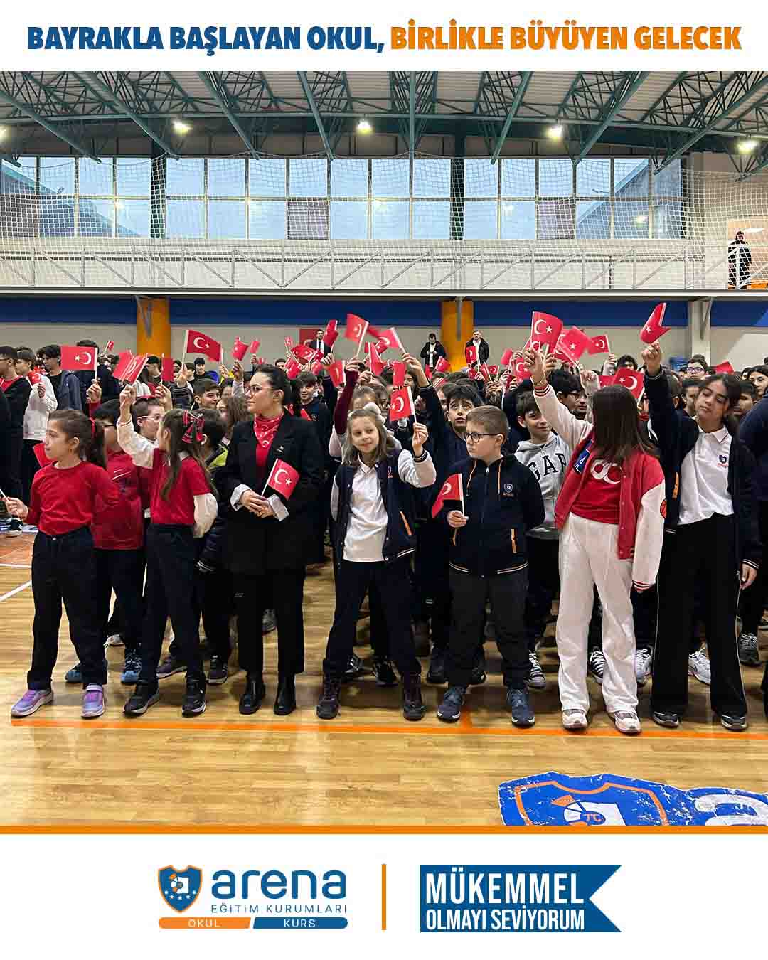 | Bugün sabah spor salonumuzda, bayrak sevgisi temasıyla İstiklal Marşı törenimizi gerçekleştirdik. İl Millî Eğitim Müdür Yardımcımız Mustafa Kahya’nın ve Arena Eğitim Kurumları Yönetim Kurulu Başkanı Celal Arslan’ın katılımıyla; bayrağımıza duyduğumuz sevgiyle İstiklal Marşımızı bir bütün olarak yaşadık. |